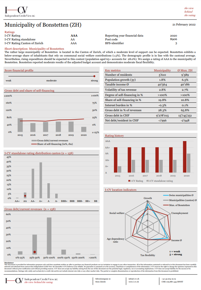For the selection and monitoring of loans to Swiss municipalities and public-sector entities, we have developed a sophisticated rating approach that combines traditional credit assessment tools with an application-based algorithm. Our reports are available in English, German and French.