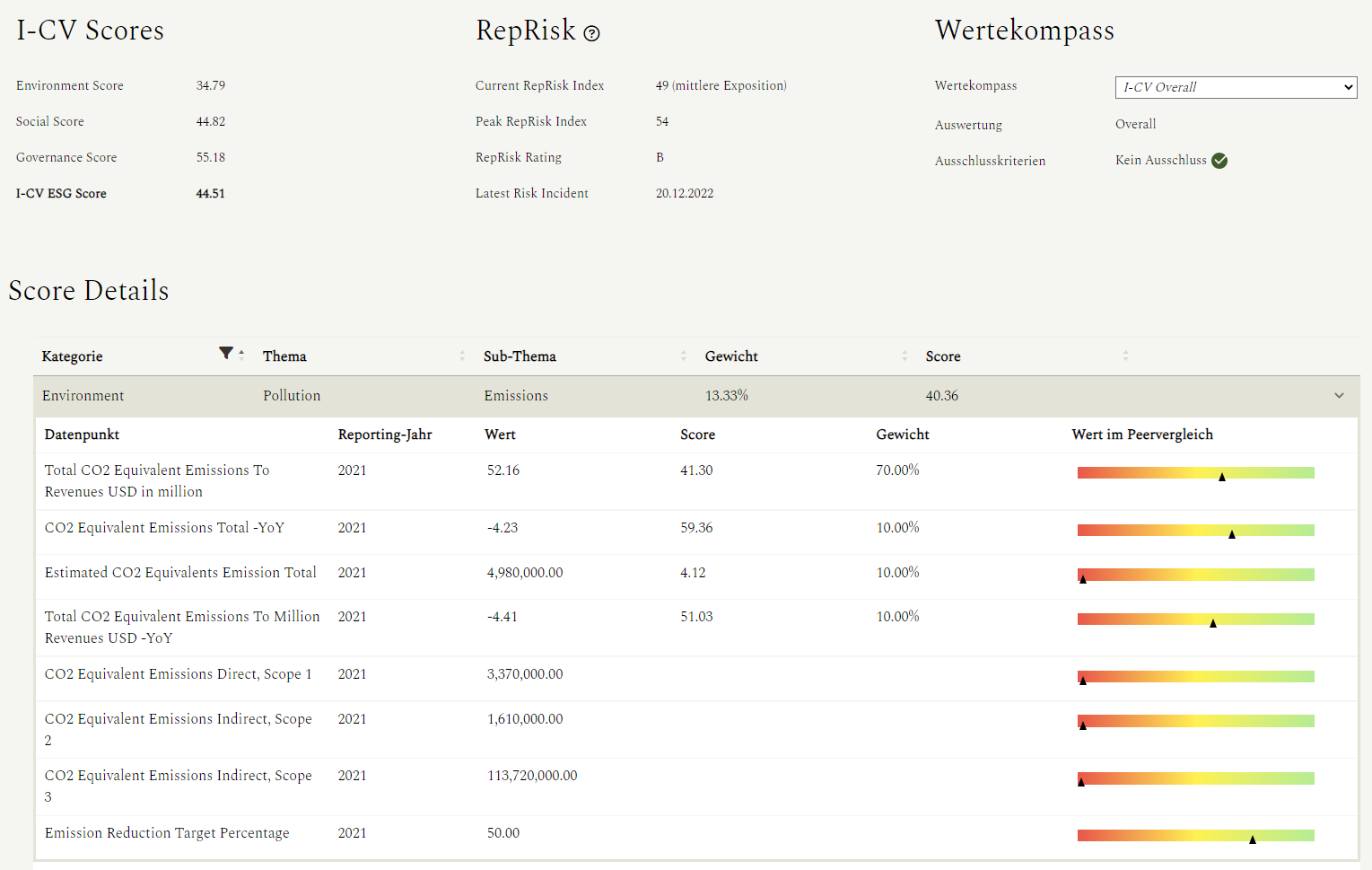Market-oriented and forward-looking solution; The guided, IT-supported process facilitates risk assessment and enables a 360-degree perspective across all asset classes regarding material ESG risks as well as their developments. The combined expertise of I-CV in collaboration with RepRisk serves investors as a unique reality check (companies’ promises vs. behavior in practice).