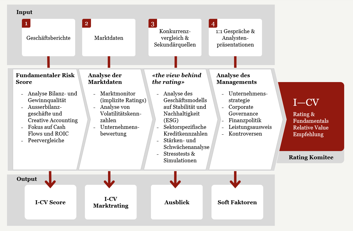 Wir arbeiten mit einem robusten Analyseverfahren, welches in einem I-CV Rating, der Einschätzung der fundamentalen Entwicklung sowie einer Empfehlung resultiert. Das I-CV Rating hat sich im Markt als unabhängige Einschätzung der Kreditqualität etabliert und als akkurater Frühwarnindikator bewährt.