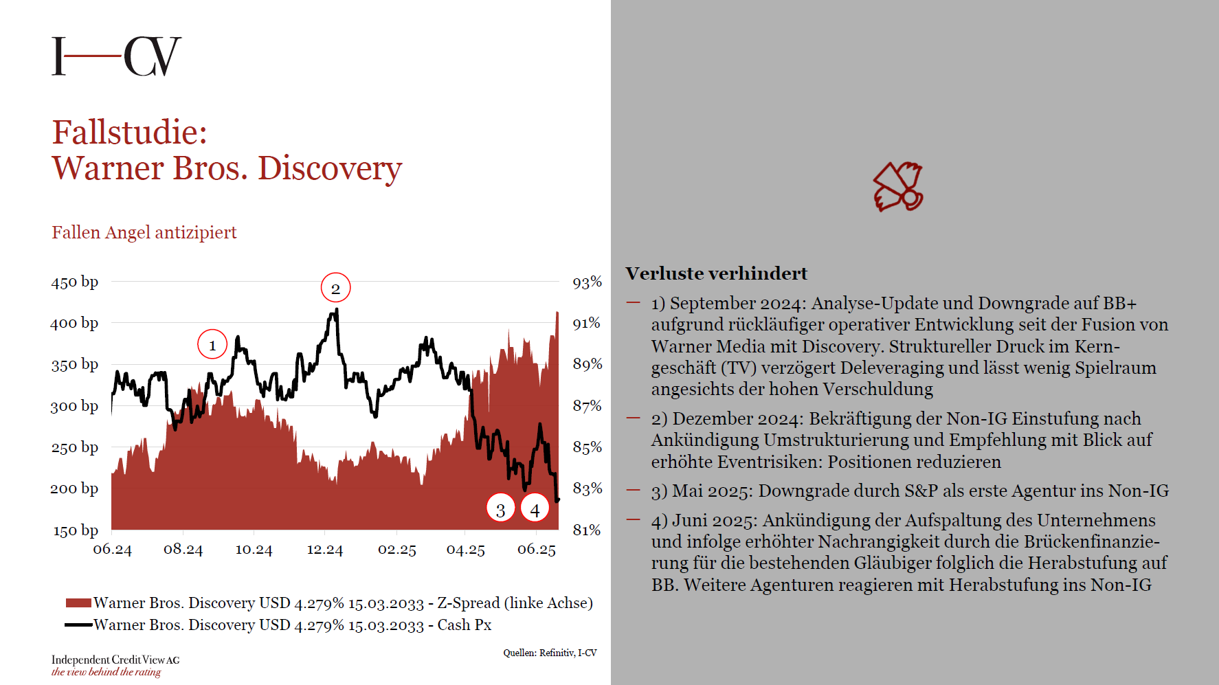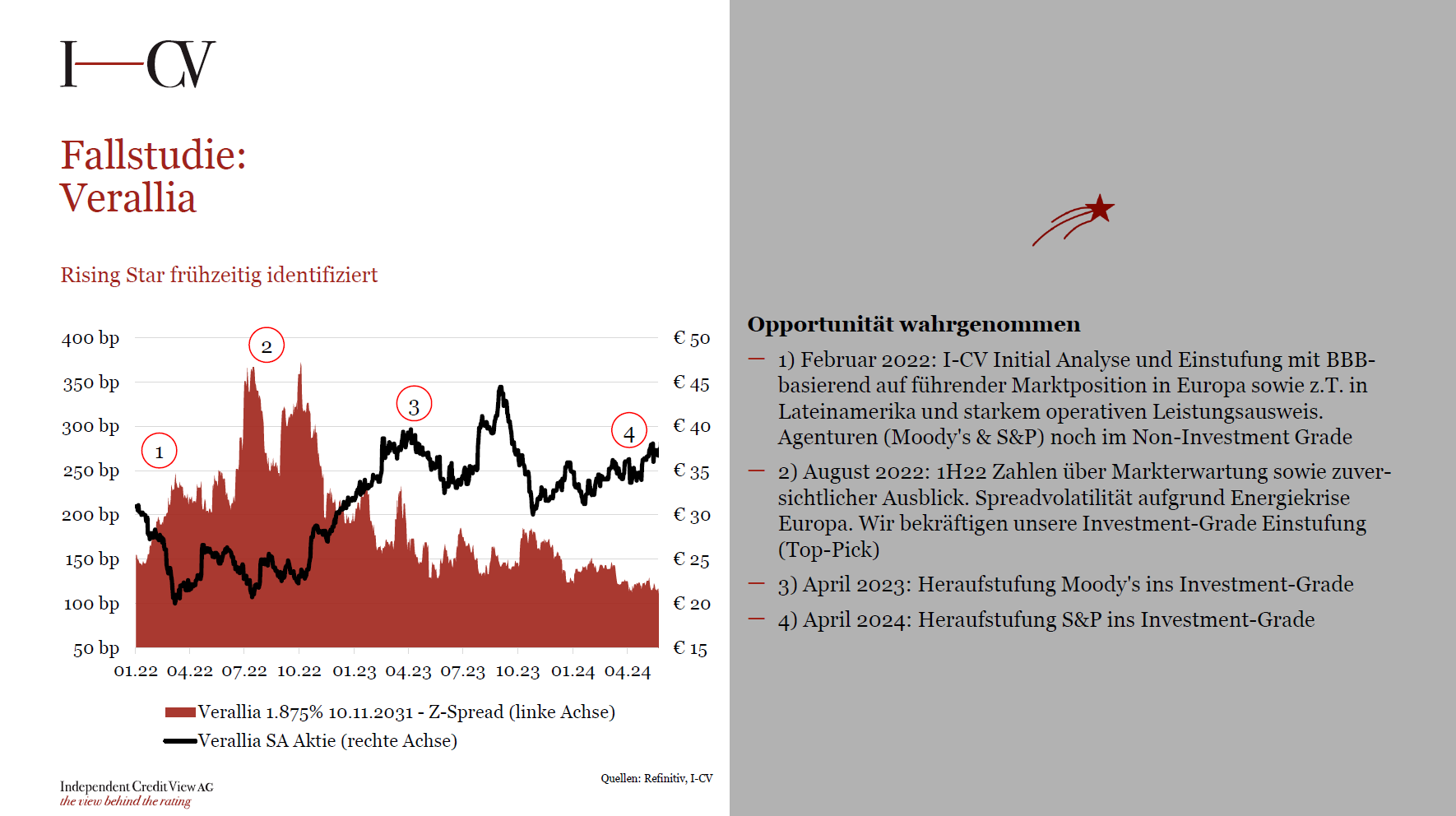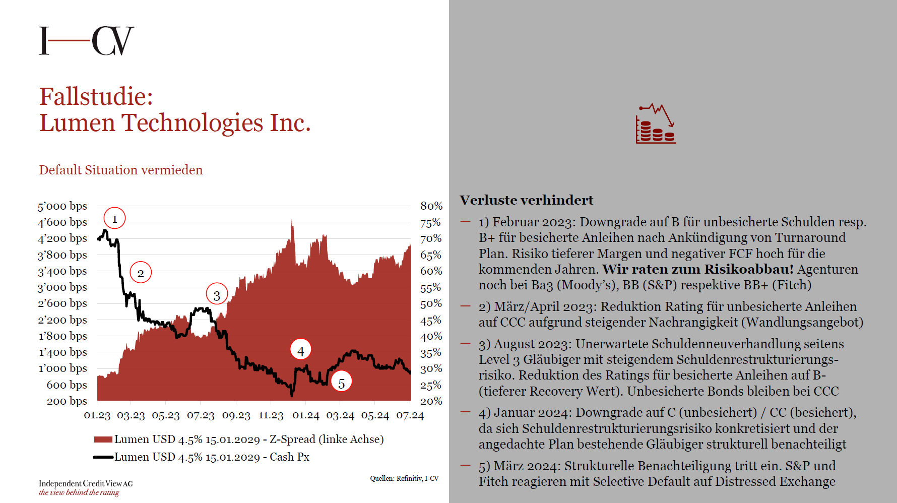 I-CV bietet Ratings und Research aus einer Hand und generiert durch prägnante Studien unmittelbaren Mehrwert. Indem Bonitätsverschiebungen frühzeitig erkannt werden, tragen wir aktiv zu einer Optimierung der Anlage- und Risikoperformance bei.